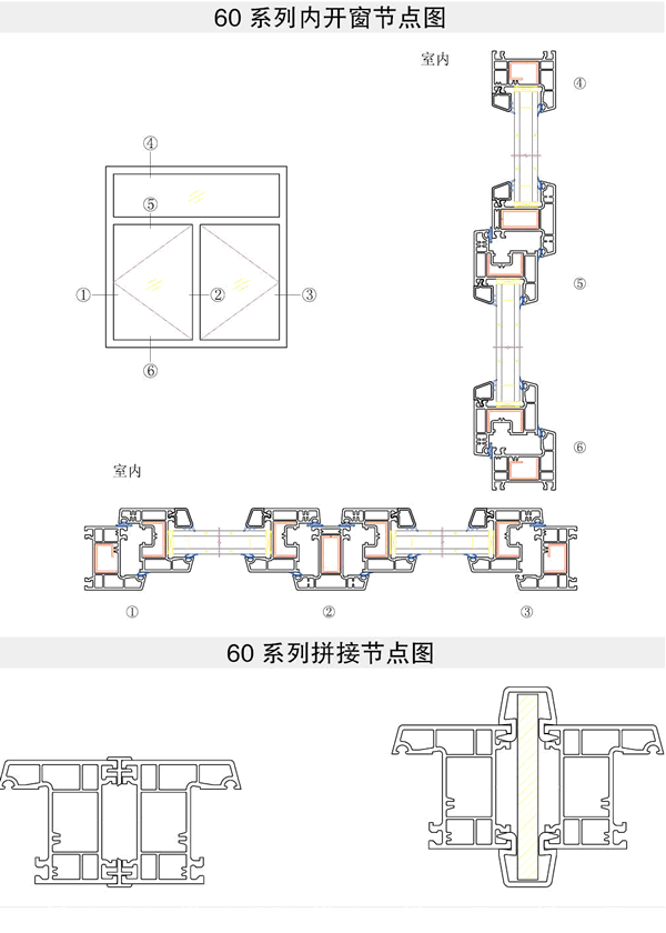 型材斷面設(shè)計合理 1、60系列主型材采用三腔結(jié)構(gòu),設(shè)有獨立排水腔、增強型鋼腔、保溫隔音腔,使熱傳導(dǎo)K值在2.0以下。 2、合理的斷面設(shè)計相應(yīng)增大了X軸慣性距,使負荷性能明顯提高。 3、斷面的三道密封設(shè)計,使窗的氣密性、水密性、隔音性大大提高,完全滿足嚴寒地區(qū)用戶需求。